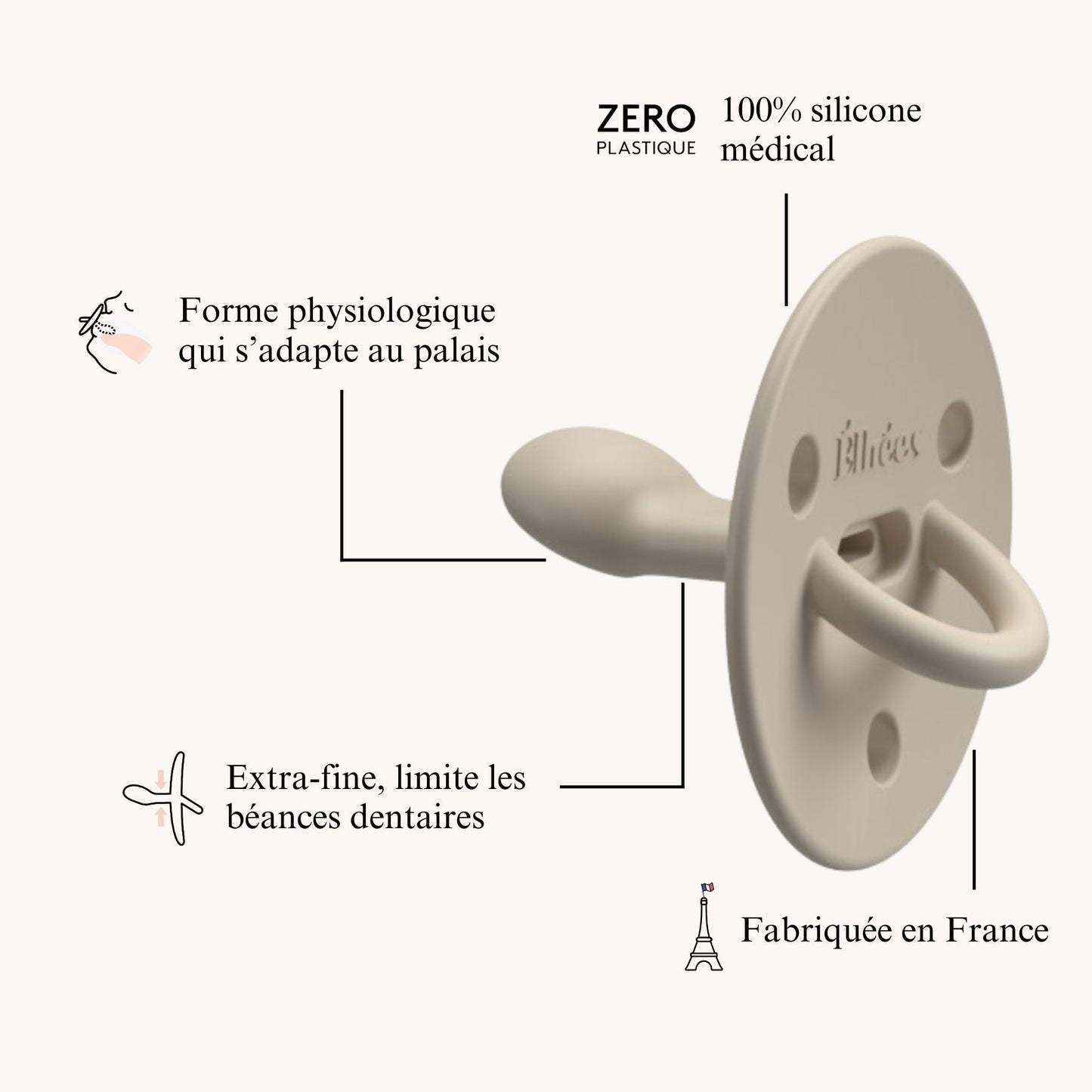 The Élhée pacifier, designed to soothe the natural sucking reflex in babies, offers an ideal solution to calm and comfort your child. Thanks to its physiological shape adapted to the baby's palate, this 100% pure medical silicone pacifier optimally stimulates babies' natural need to suck, thus promoting a feeling of security and well-being in the infant.